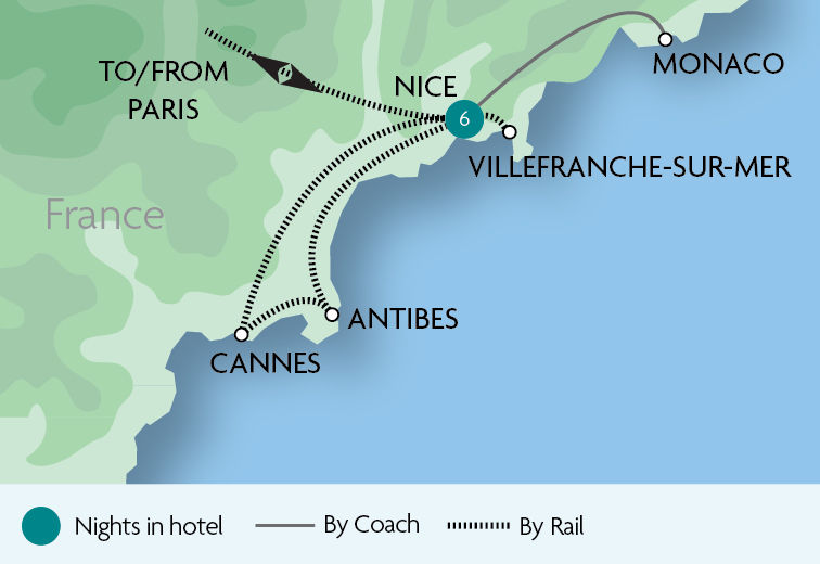 Explore the French Riviera from a hotel just a short walk from Nice's palm-lined Promenade des Anglais and its long beaches. Visit beautiful seaside towns with time to explore at your own pace. Discover colourful Villefrance-sur-Mer, uncover the history of the old port of Antibes, and savour the charm of Cannes. During a guided tour of...