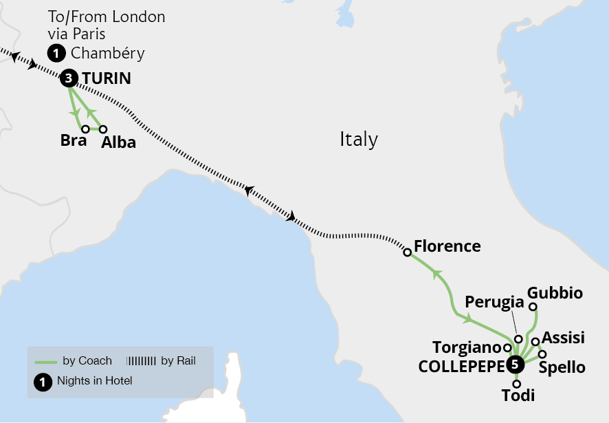 Enjoy iconic Italian gastronomy on this twin-centre holiday in Piedmont and Umbria. Sample wine, olive oil and chocolate and visit UNESCO World Heritage sites in Assisi and Florence. Uncover the allure of Piedmont from the old capital city of Turin, travelling to Bra and Alba, whose Nebbiolo wine leaves a lasting impression. After viewing the...