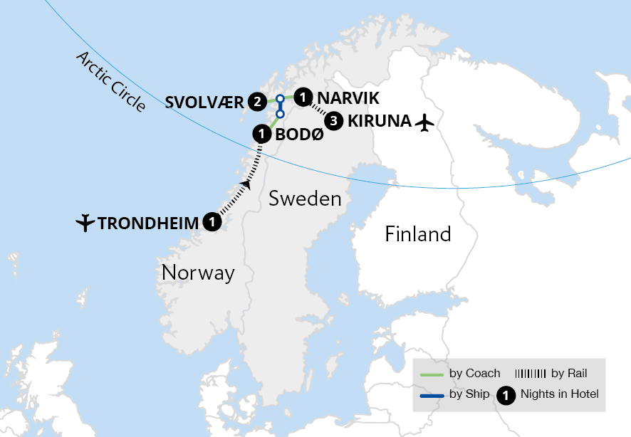 Spellbinding Scandinavian rail journeys take us from the ancient Viking capital of Trondheim to Swedish Lapland, visiting the best places to see the Aurora Borealis, with many opportunities to experience these swirling lights. Travelling by rail through amazing landscapes, cross the Arctic Circle to Bodø to seek the ethereal Northern Lights...