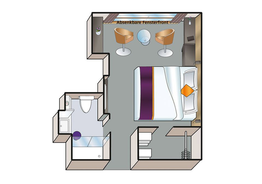 These ensuite cabins are stylish and impressively spacious at 17.5 square metres, with a panoramic window balcony and seating area.