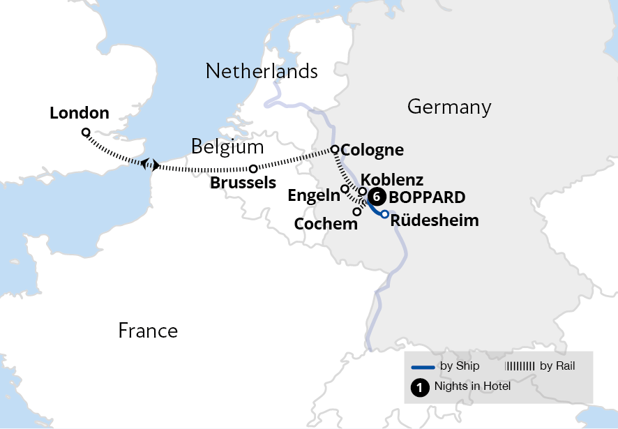 After our final breakfast together, we board the coach to Cologne, where we continue to Brussels by rail. In the Belgian capital, we switch to the Eurostar for the final leg of our journey back to London St Pancras. Arriving this evening, your discovery of the scenic Rhine Valley comes to an end and you are free to make your way home.