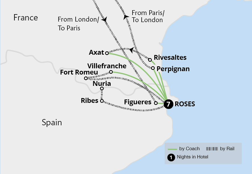 Rolling foothills, sprawling ocean views and Pyrenean peaks lie ahead on this holiday on the coast of Catalonia. While based at a beachfront resort in Roses, experience the undulations of the landscape and the region's idyllic towns with four distinct rail experiences. Uncover lush views of the Núria Valley on the Núria Valley Rack Railway...